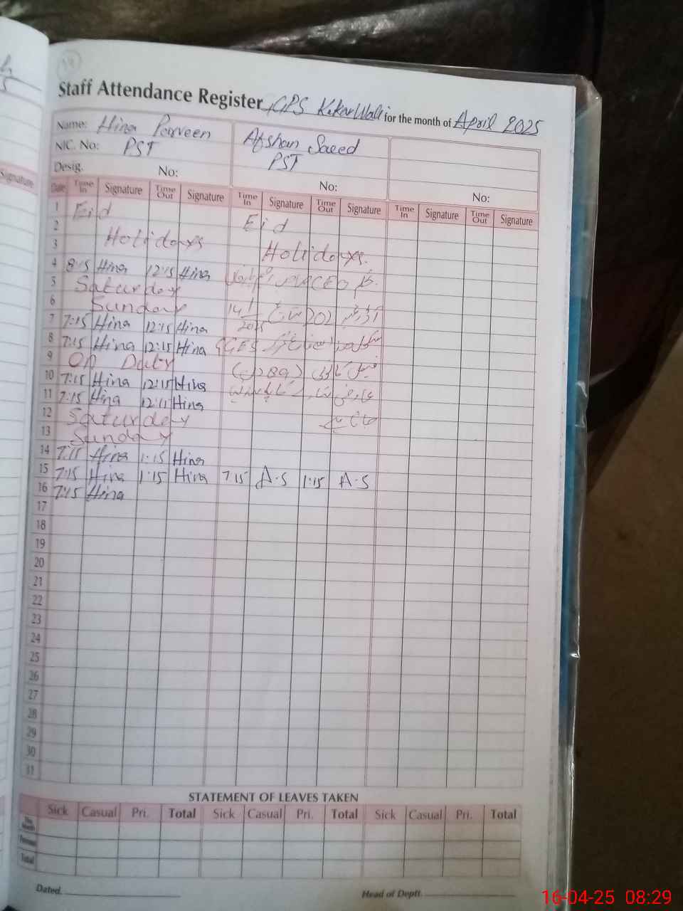 | CNIC | Full Name | Designation | R/C | Absence During Last Calender Month |