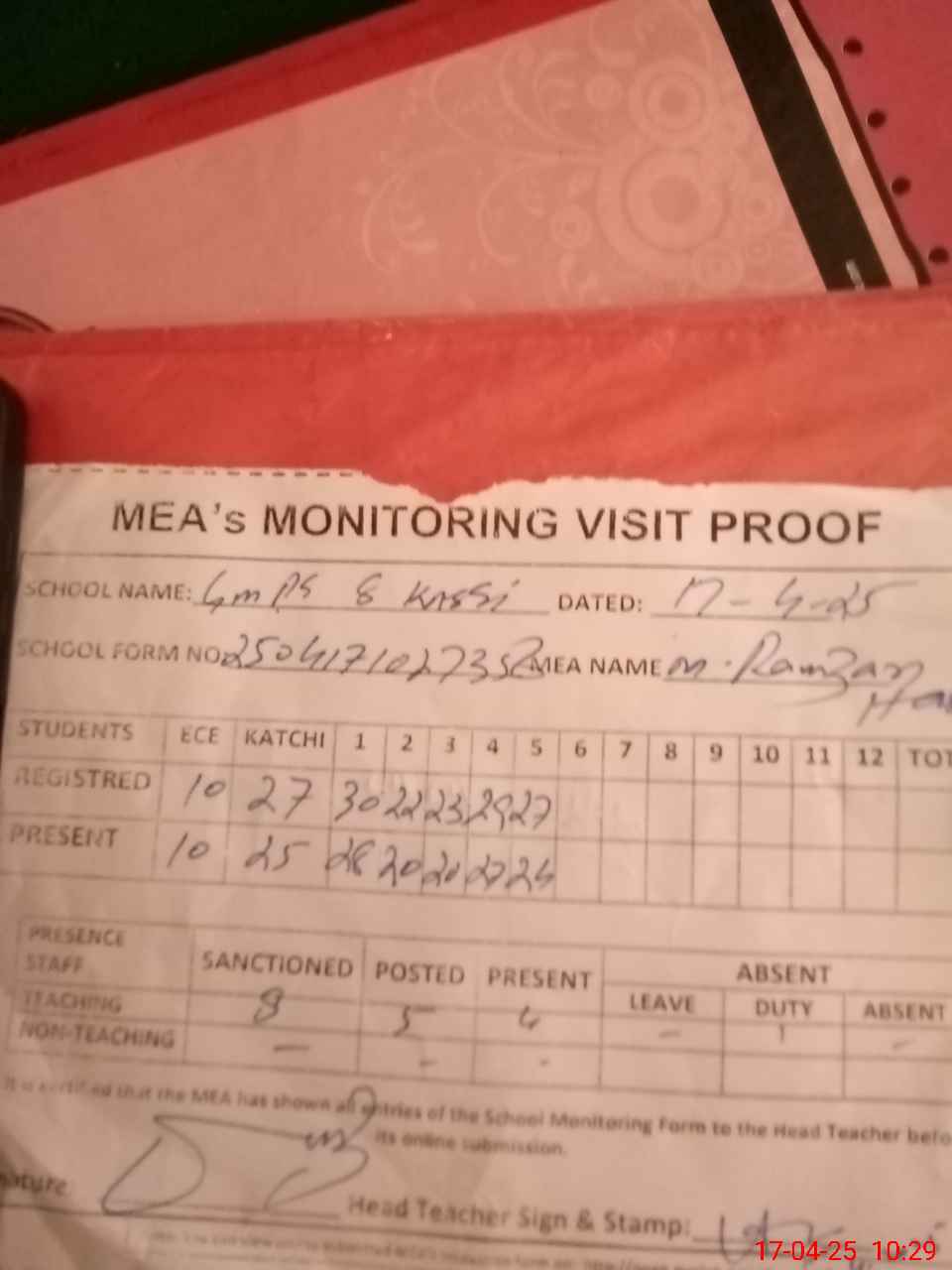 | Attendance Register | Head Teacher | MEA with School | Visit Proof |