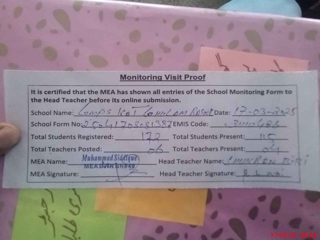 | EMIS Code: 31110486 | Name of School: GMPS KOT GHULAM RASOOL | |||