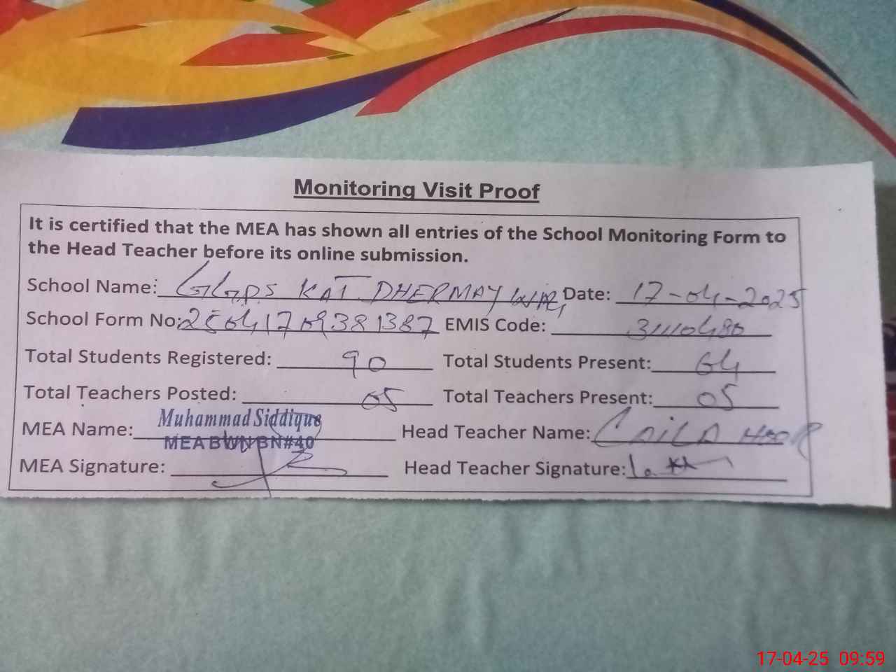 | Attendance Register | Head Teacher | MEA with School | Visit Proof |