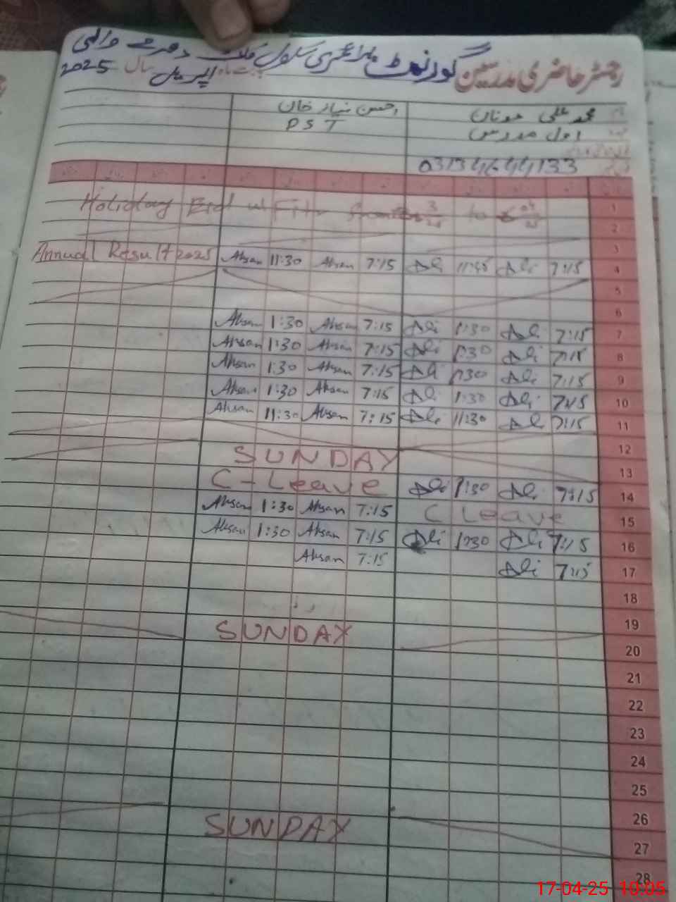 | 31**** | Mu**** Mu**** | PST | Regular | 0 | 0 | 0 | 0 | 0 | 0 | 0 | 0 | 0 | Exam Duty |