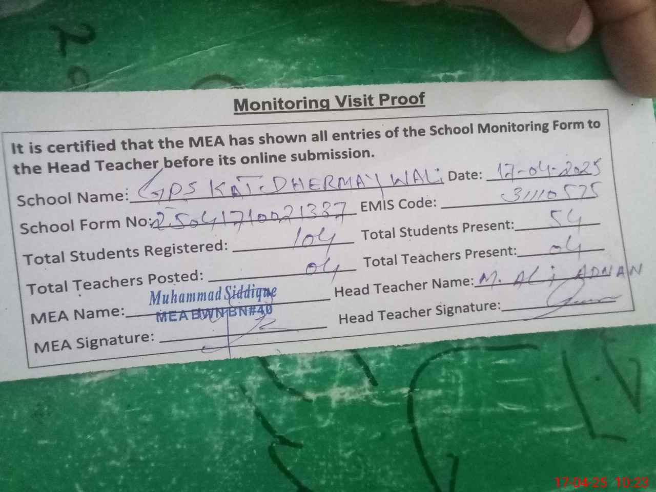 | Attendance Register | Head Teacher | MEA with School | Visit Proof |