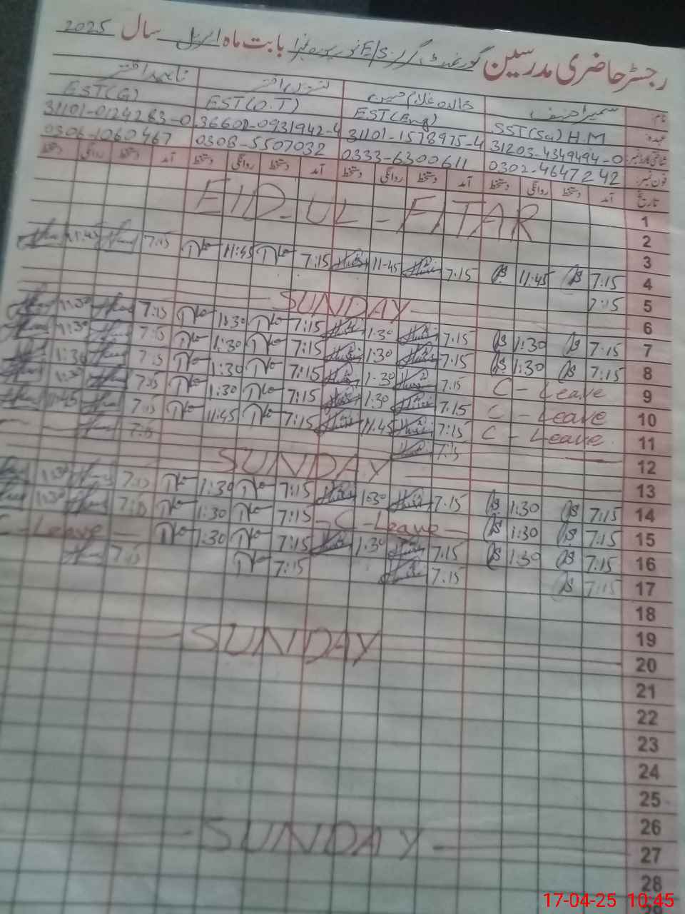| CNIC | Full Name | Designation | R/C | Absence During Last Calender Month |