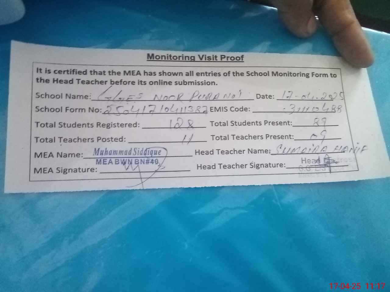 | Attendance Register | Head Teacher | MEA with School | Visit Proof |