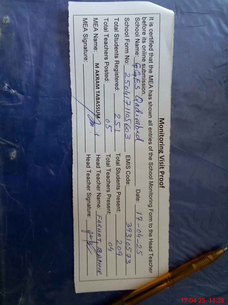 | Attendance Register | Head Teacher | MEA with School | Visit Proof |