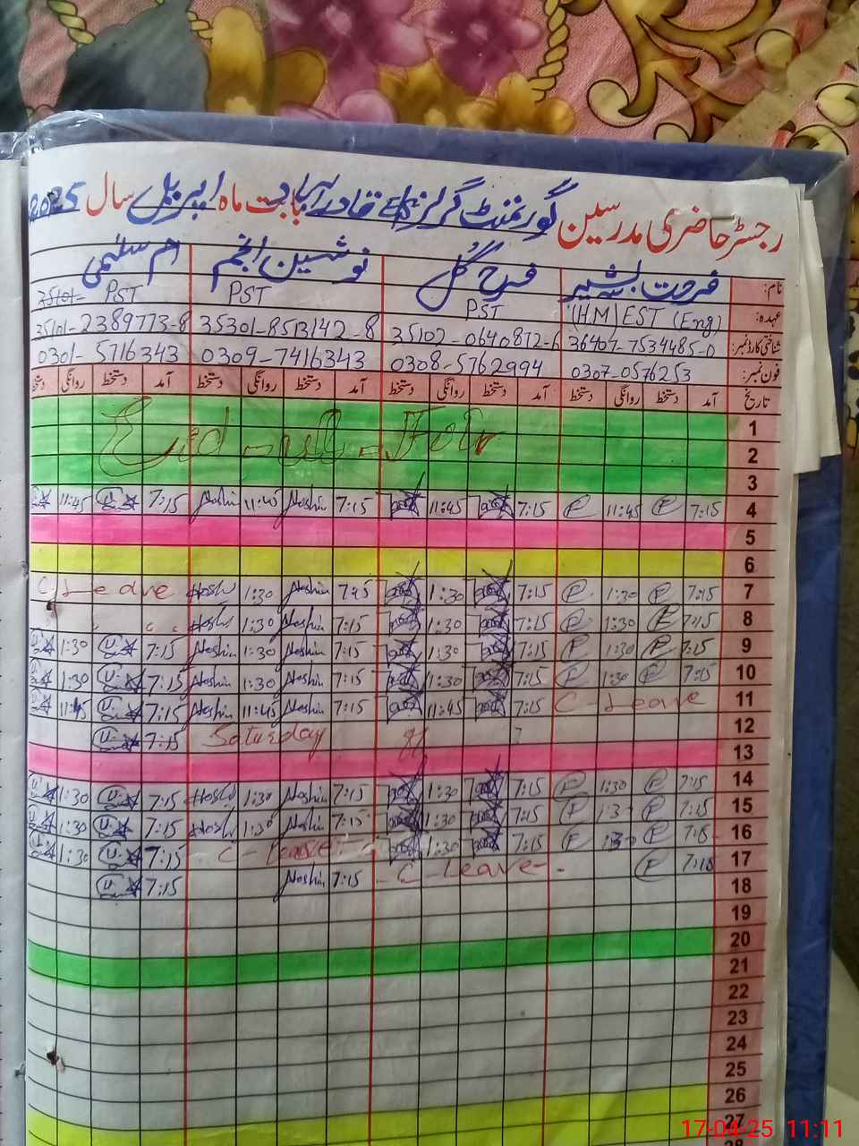 | CNIC | Full Name | Designation | R/C | Absence During Last Calender Month |