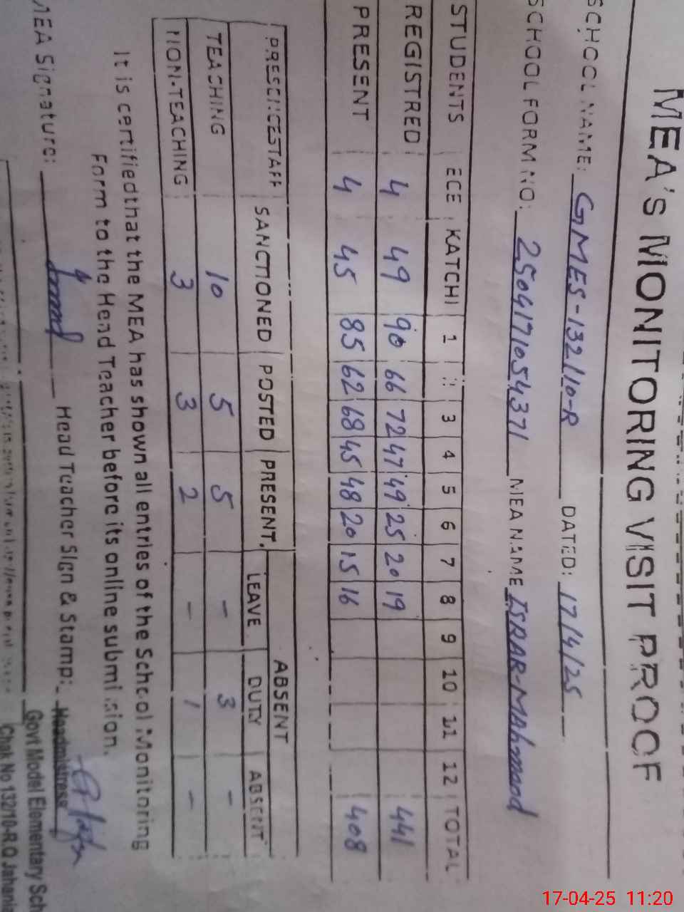 | Attendance Register | Head Teacher | MEA with School | Visit Proof |