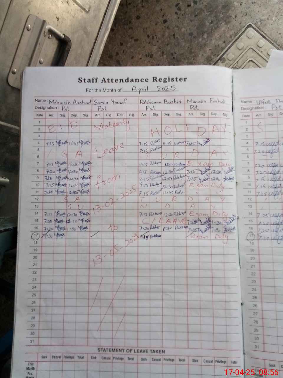 | 37**** | Mu**** Fa**** | 1 | 0 | 12 | 0 | 0 | 0 | 0 | 0 | 0 | 0 | Exam Duty | |