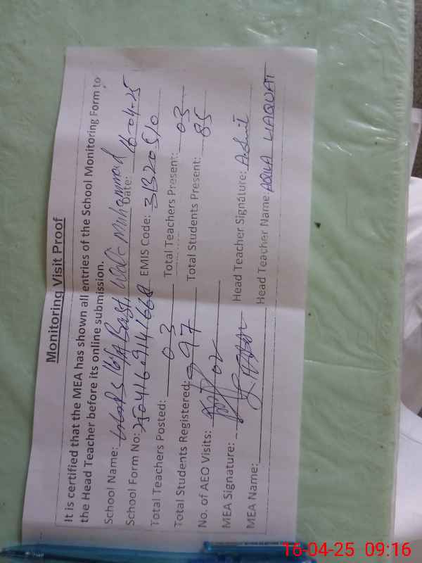| Attendance Register | Head Teacher | MEA with School | Visit Proof |