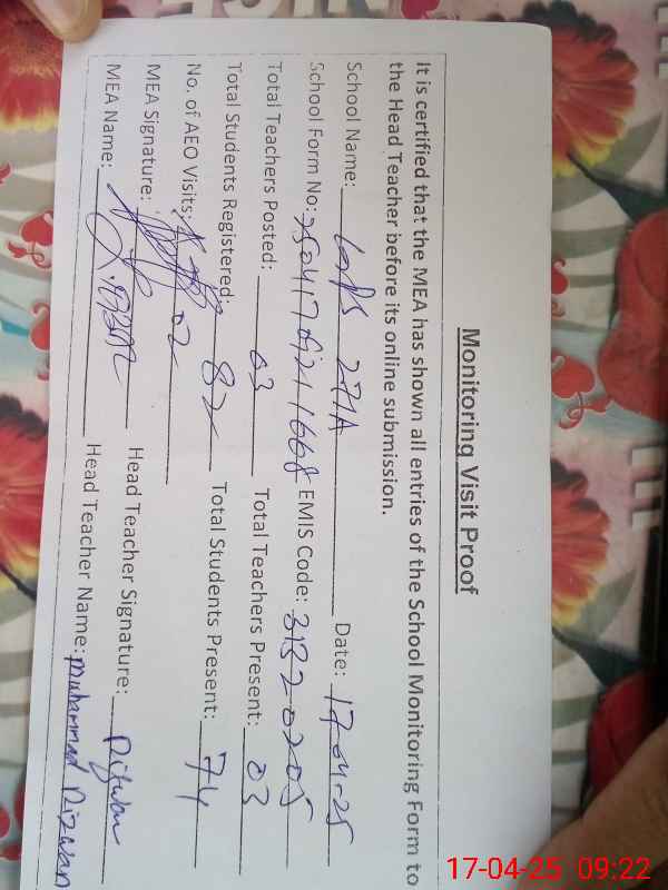 | Certified that this School was Inspected by the Undersigned MEA/DMO Today and the Information Stated Above is as Per Record. | |||||