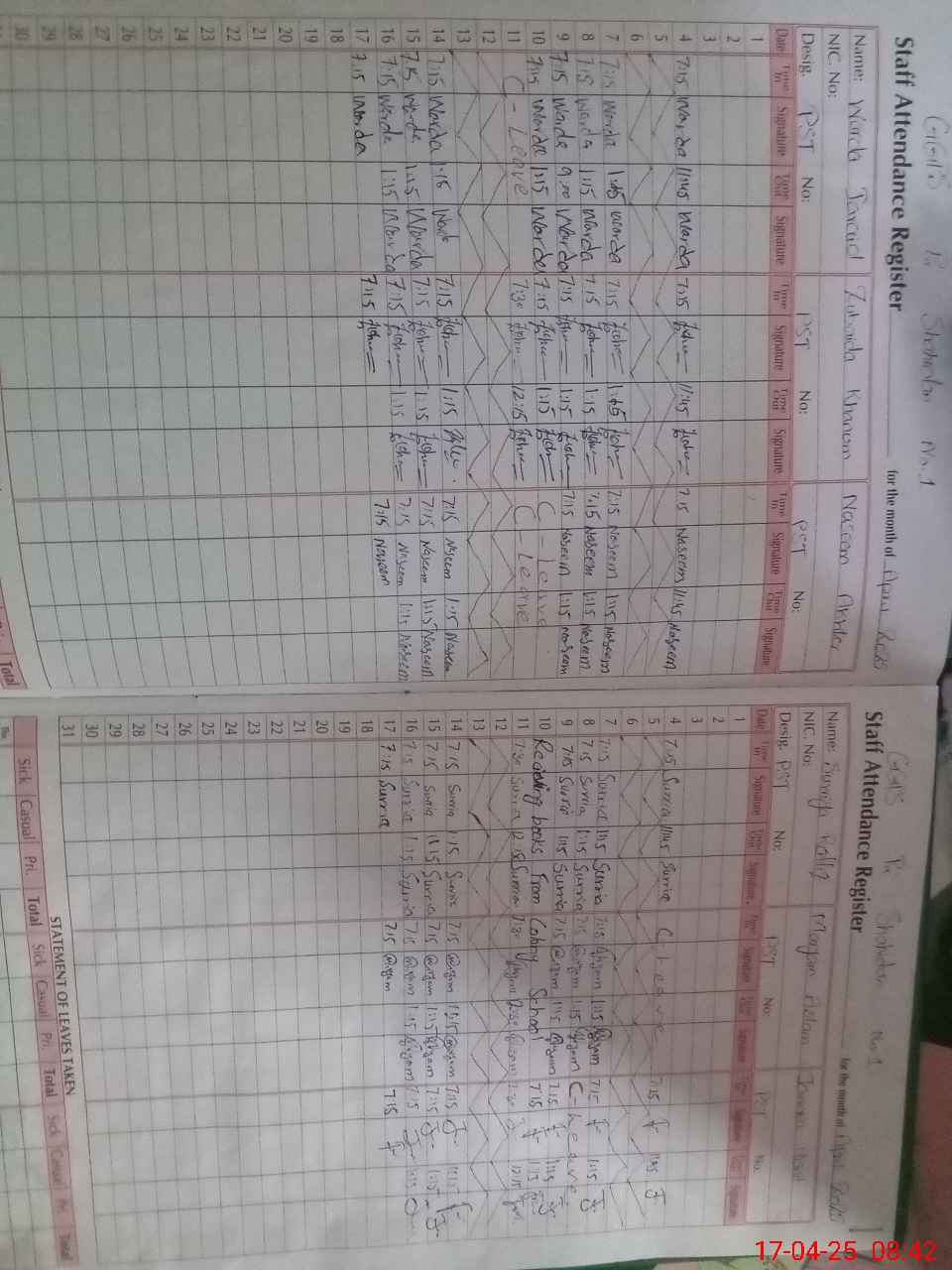 | CNIC | Full Name | Designation | R/C | Absence During Last Calender Month |