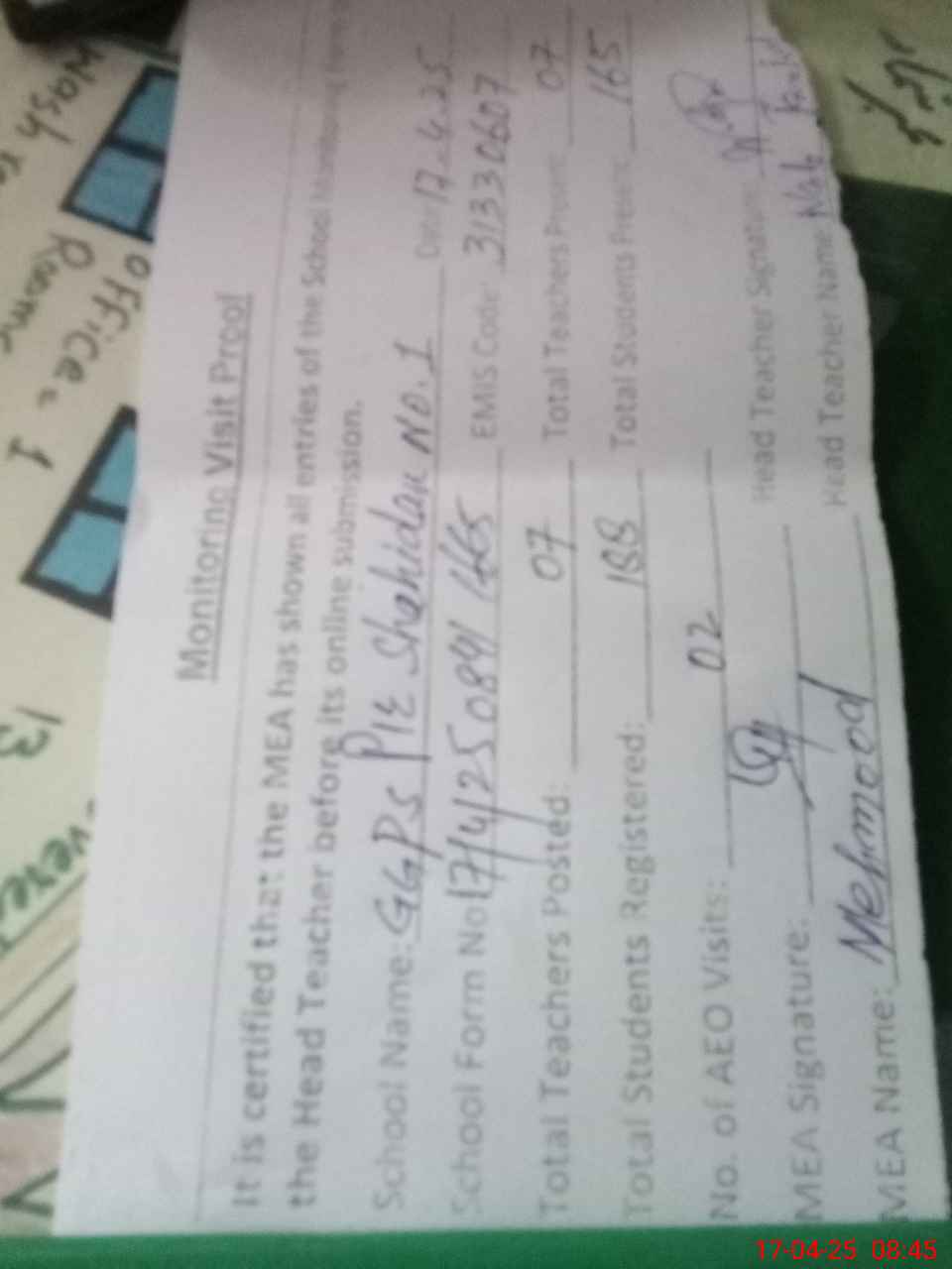 | Attendance Register | Head Teacher | MEA with School | Visit Proof |