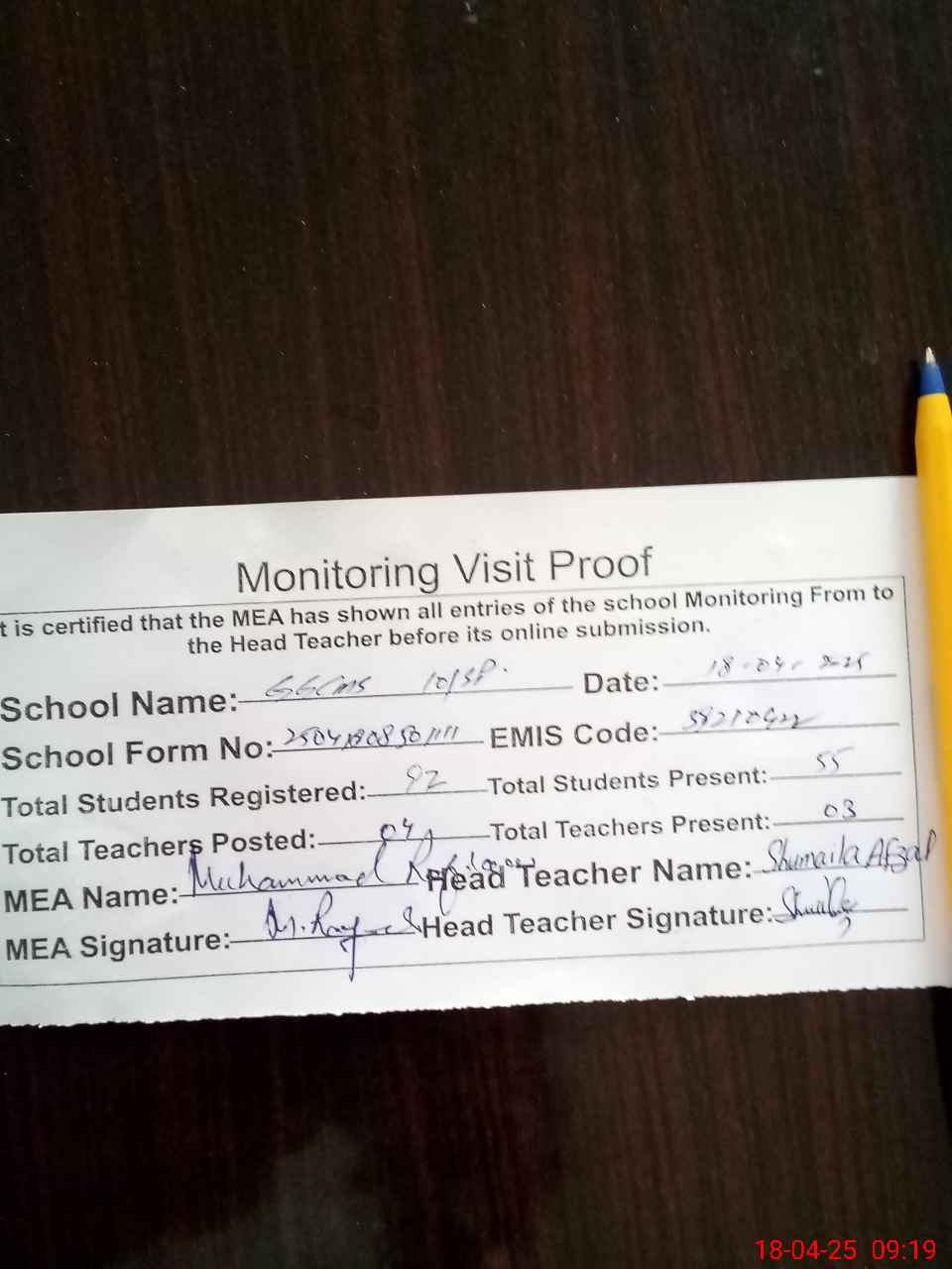 | Attendance Register | Head Teacher | MEA with School | Visit Proof |