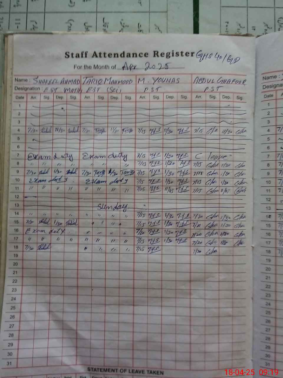 | 35**** | Ta**** Ma**** | 1 | 0 | 12 | 0 | 0 | 0 | 0 | 0 | 0 | 0 | Exam Duty | |