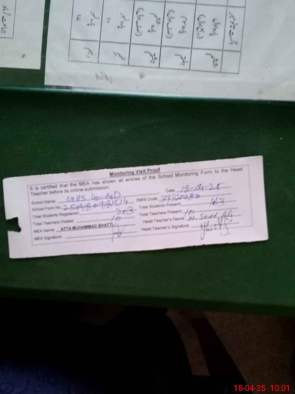 | Attendance Register | Head Teacher | MEA with School | Visit Proof |