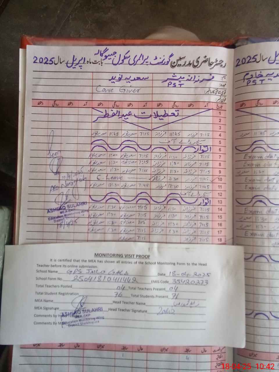 | Attendance Register | Head Teacher | MEA with School | Visit Proof |