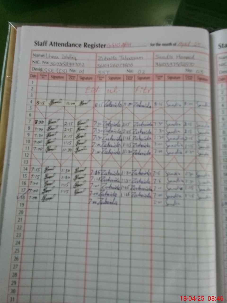 | CNIC | Full Name | Designation | R/C | Absence During Last Calender Month |