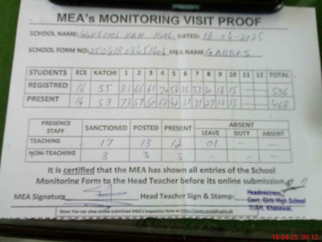 | Attendance Register | Head Teacher | MEA with School | Visit Proof |