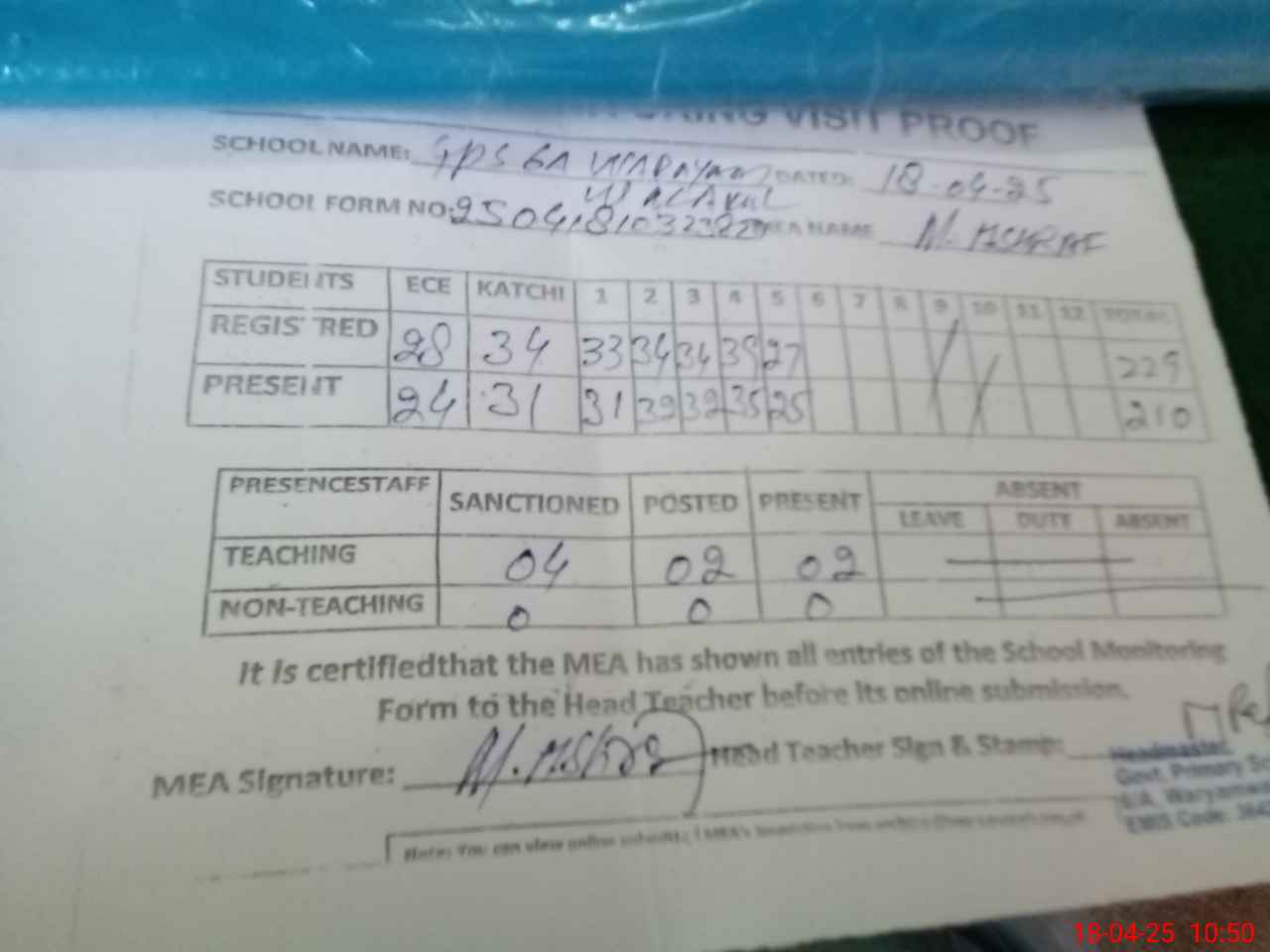 | Attendance Register | Head Teacher | MEA with School | Visit Proof |