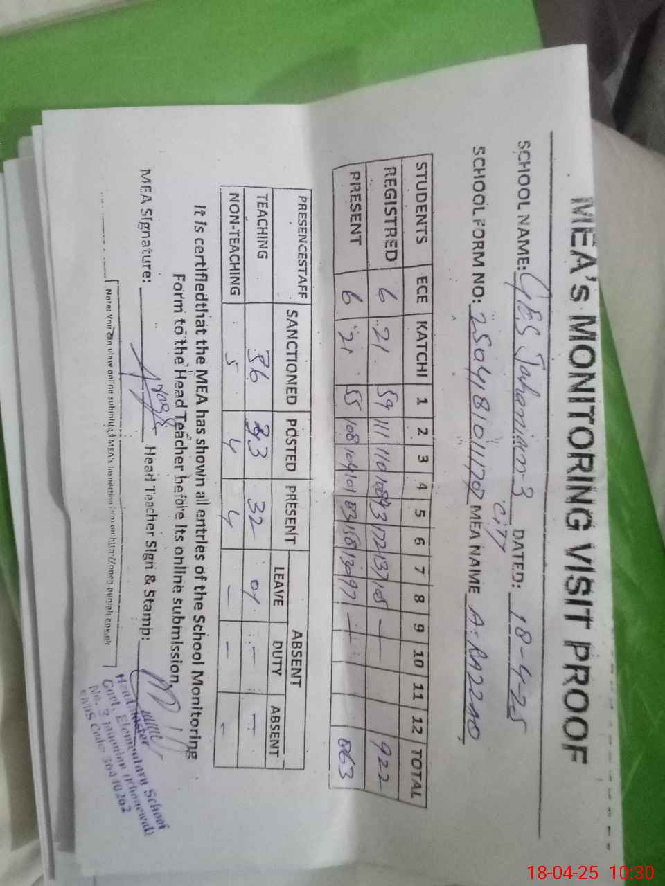 | Attendance Register | Head Teacher | MEA with School | Visit Proof |