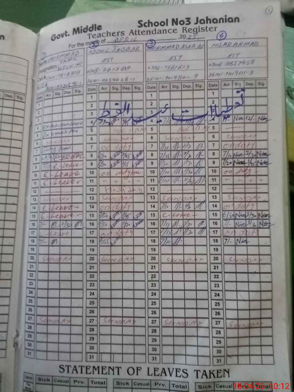 | CNIC | Full Name | Designation | R/C | Absence During Last Calender Month |