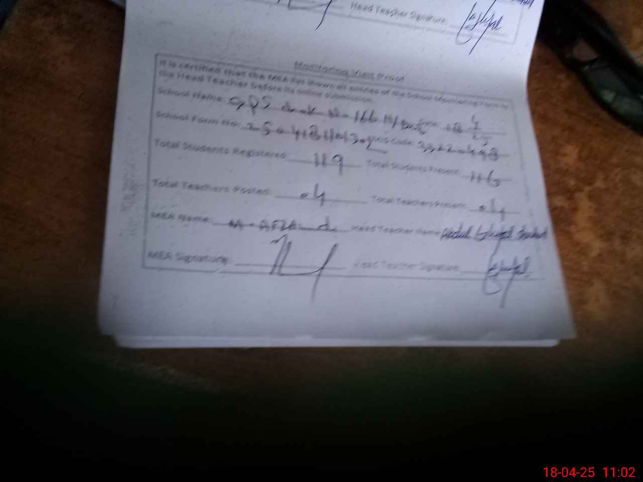 | Attendance Register | Head Teacher | MEA with School | Visit Proof |