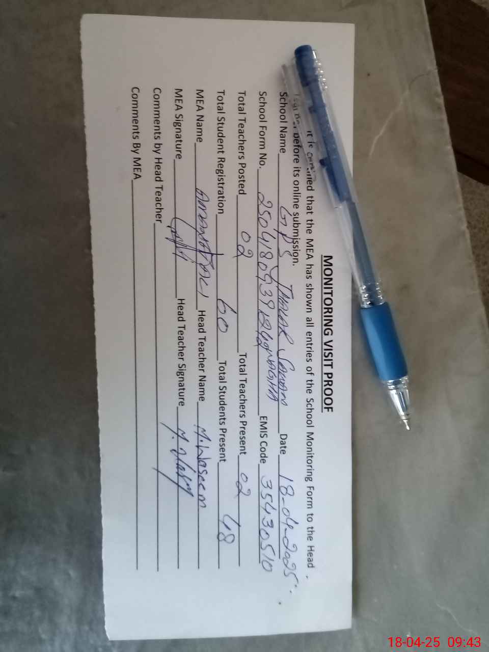 | Attendance Register | Head Teacher | MEA with School | Visit Proof |