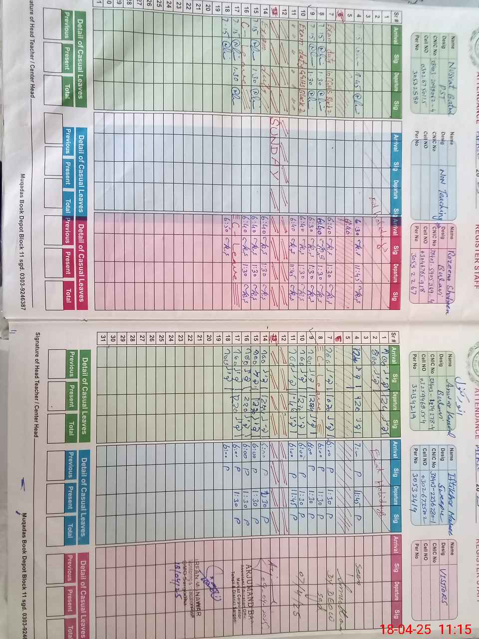 | CNIC | Full Name | Designation | R/C | Absence During Last Calender Month |
