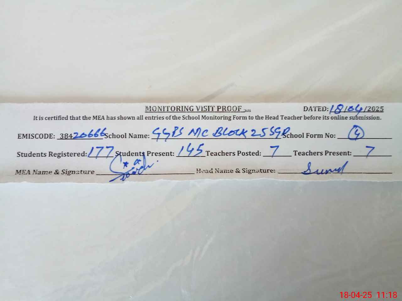 | Attendance Register | Head Teacher | MEA with School | Visit Proof |