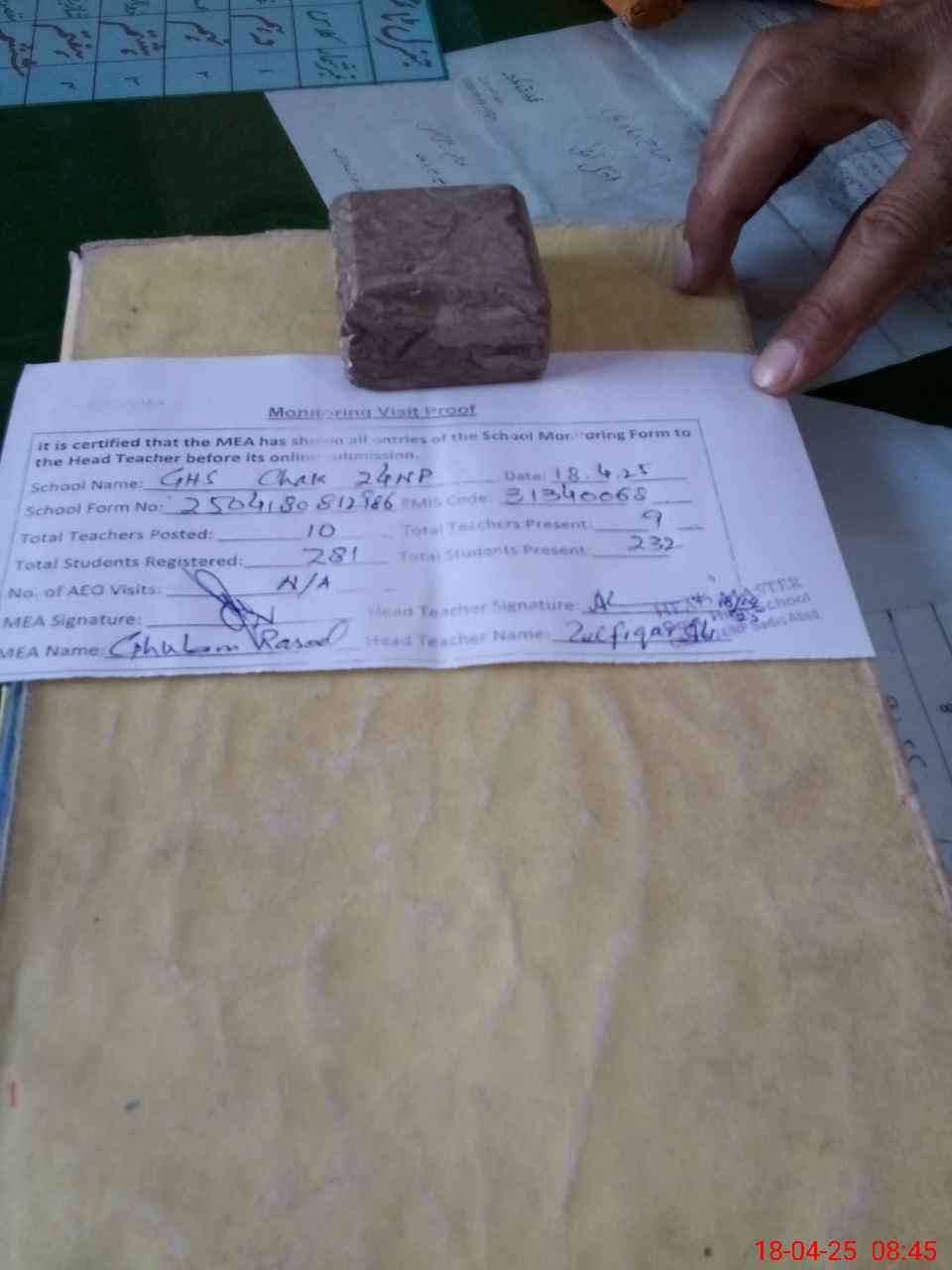 | Attendance Register | Head Teacher | MEA with School | Visit Proof |