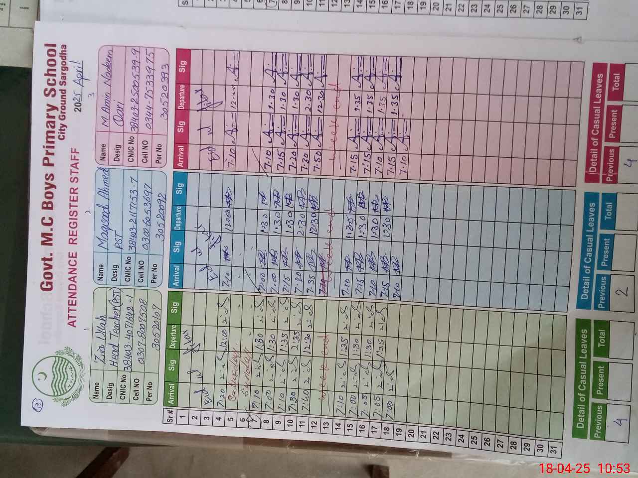| CNIC | Full Name | Designation | R/C | Absence During Last Calender Month |