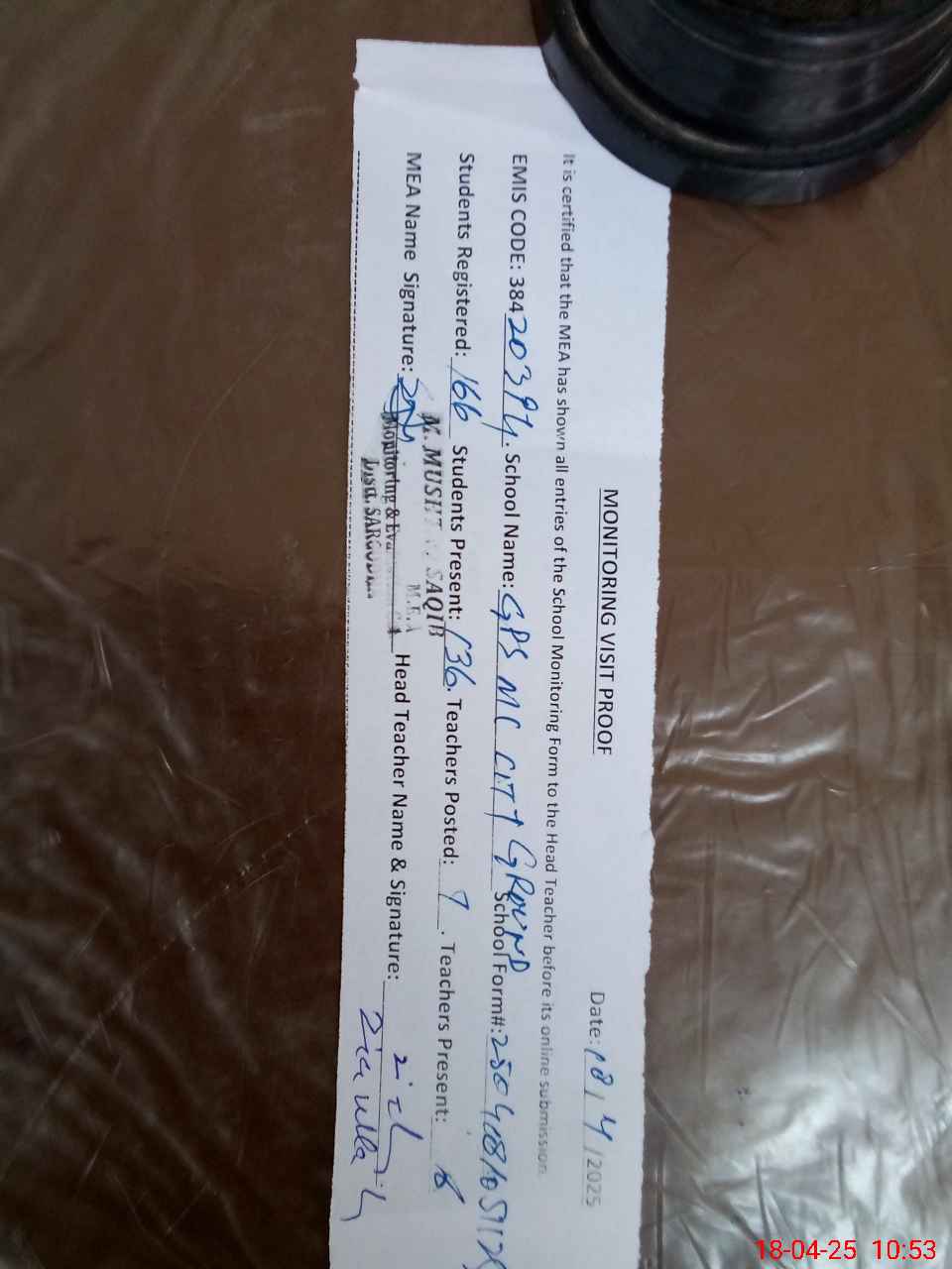 | Attendance Register | Head Teacher | MEA with School | Visit Proof |