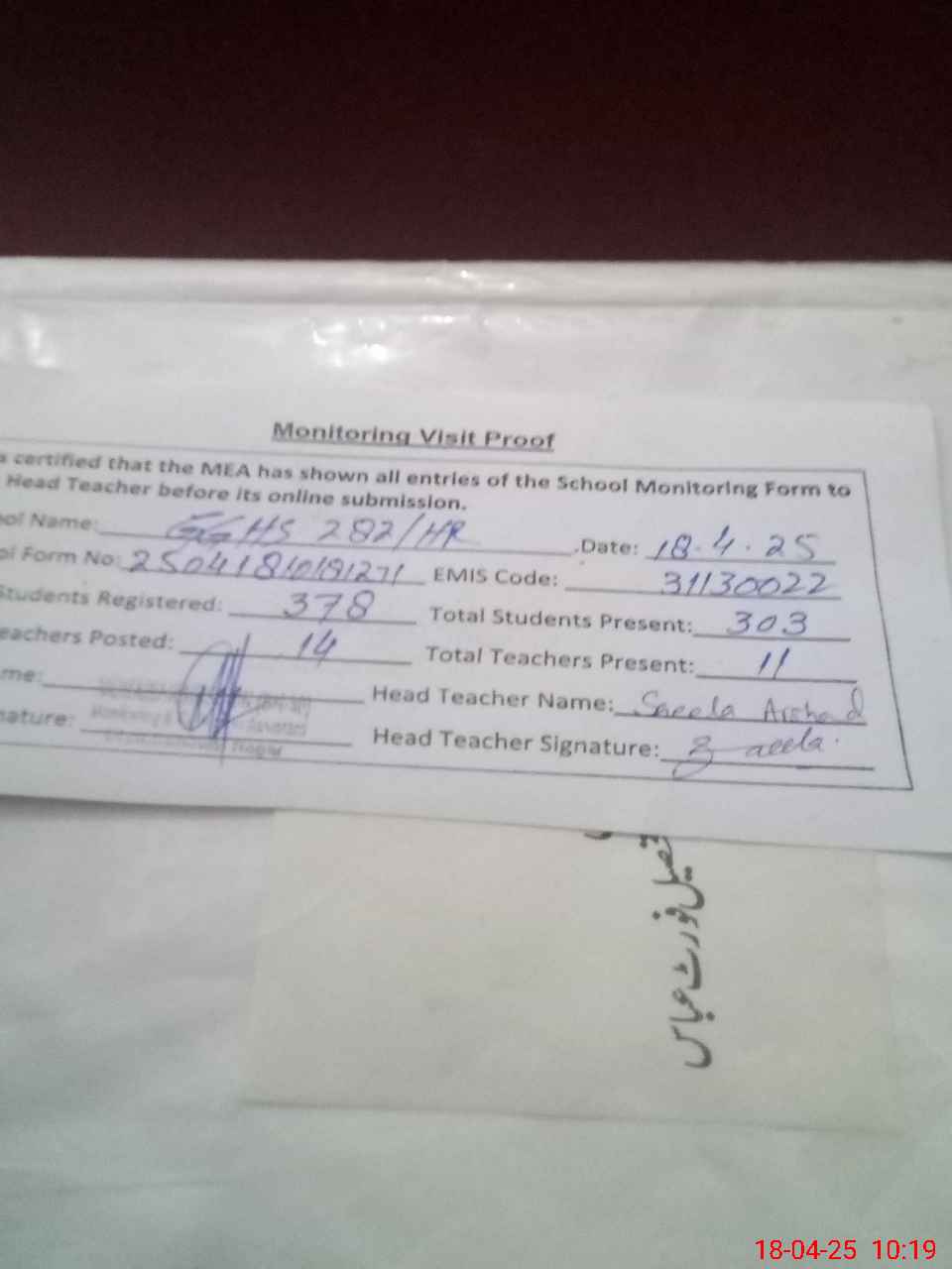 | EMIS Code: 31130022 | Name of School: GGHS CHAK NO 282 HR | |||