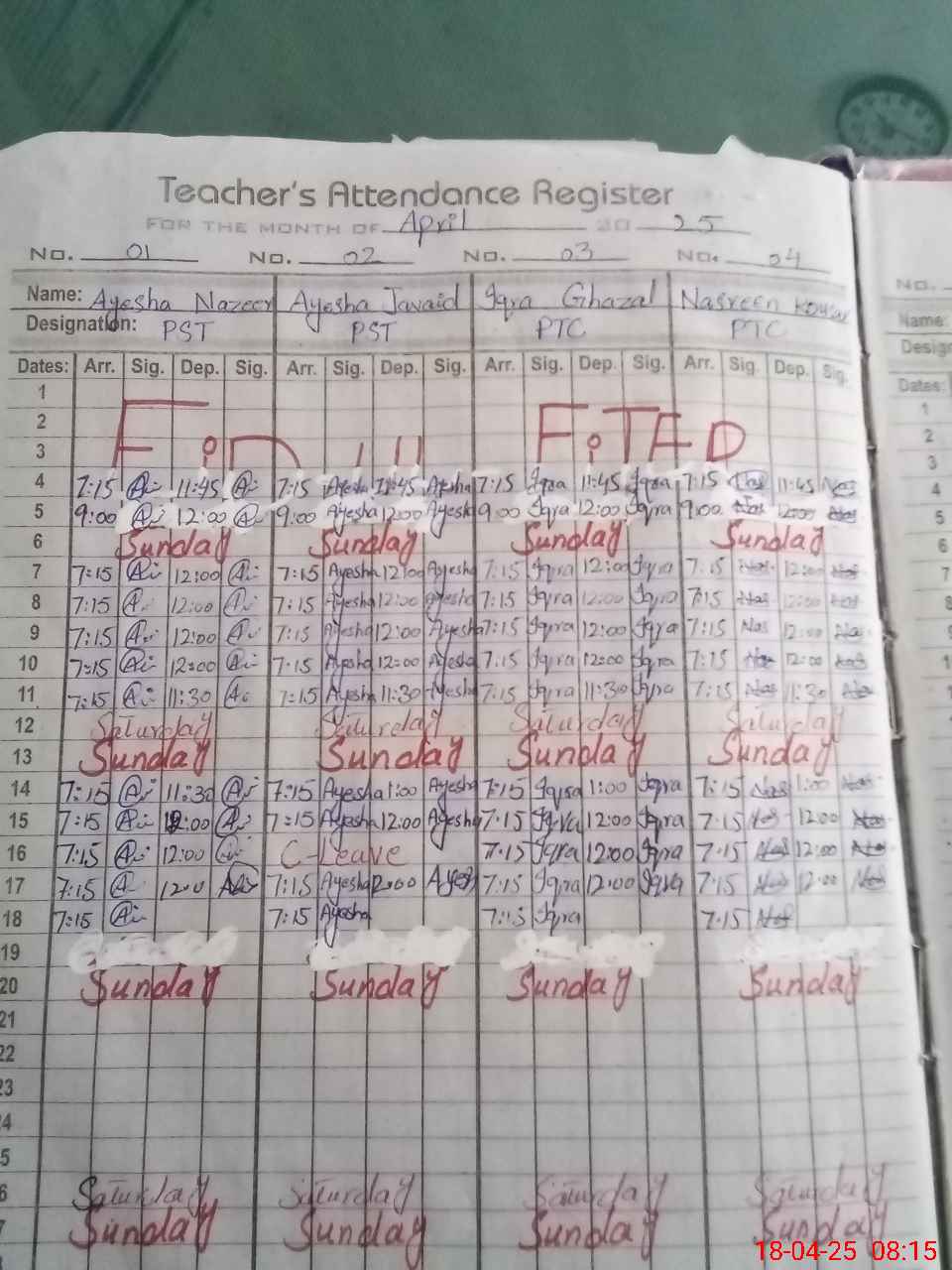 | CNIC | Full Name | Designation | R/C | Absence During Last Calender Month |