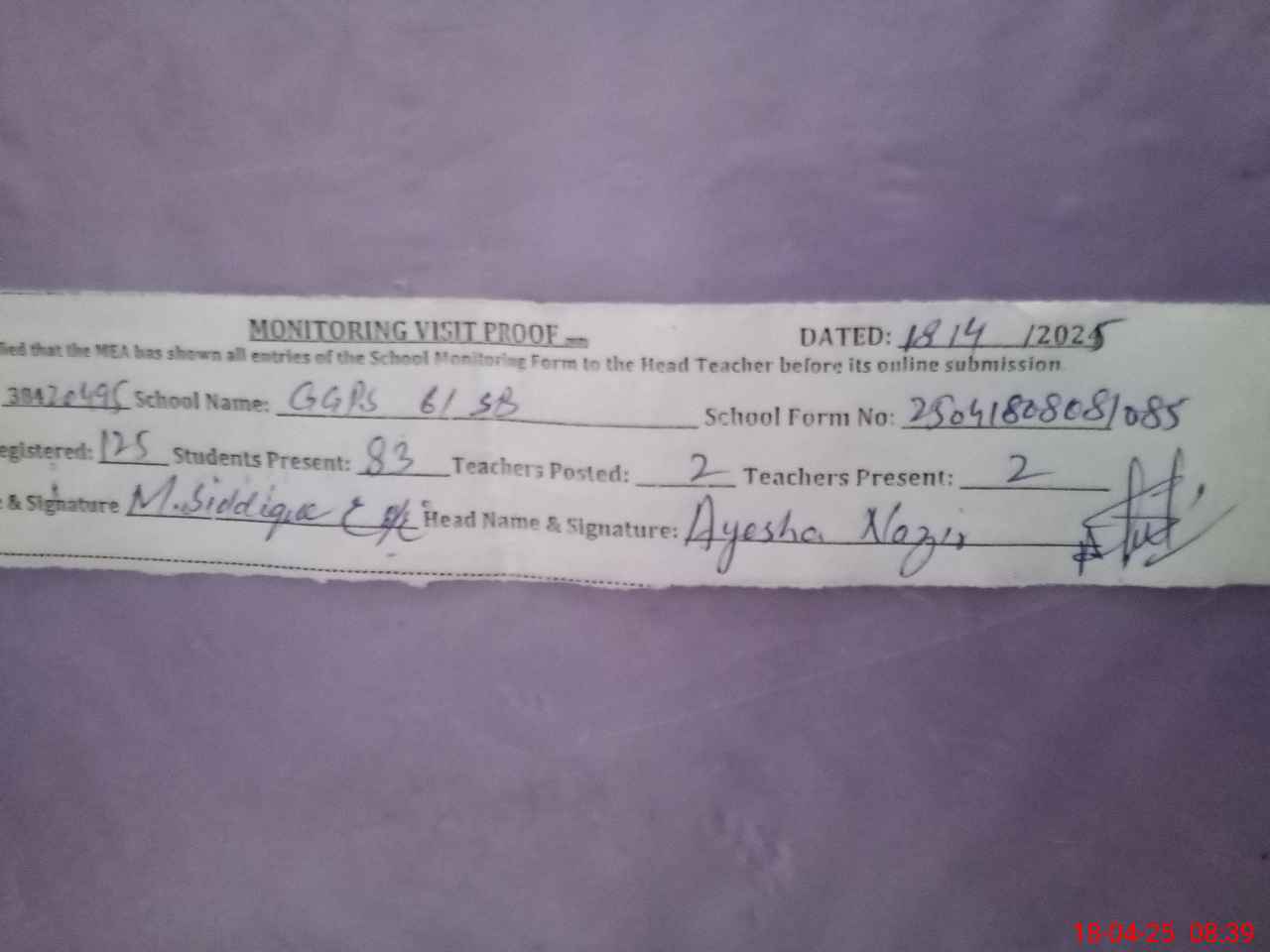 | Attendance Register | Head Teacher | MEA with School | Visit Proof |