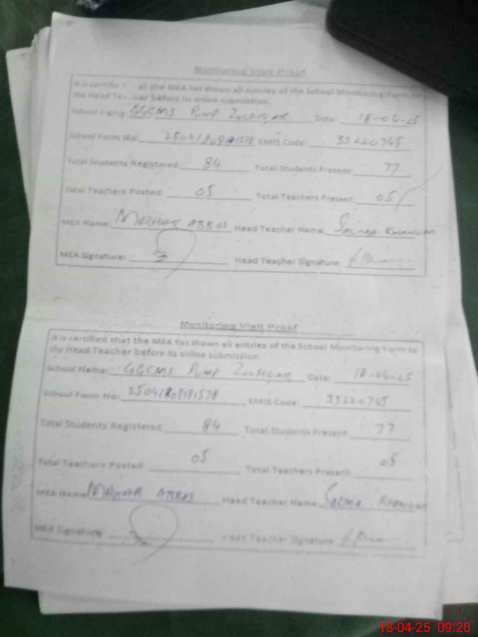 | Attendance Register | Head Teacher | MEA with School | Visit Proof |