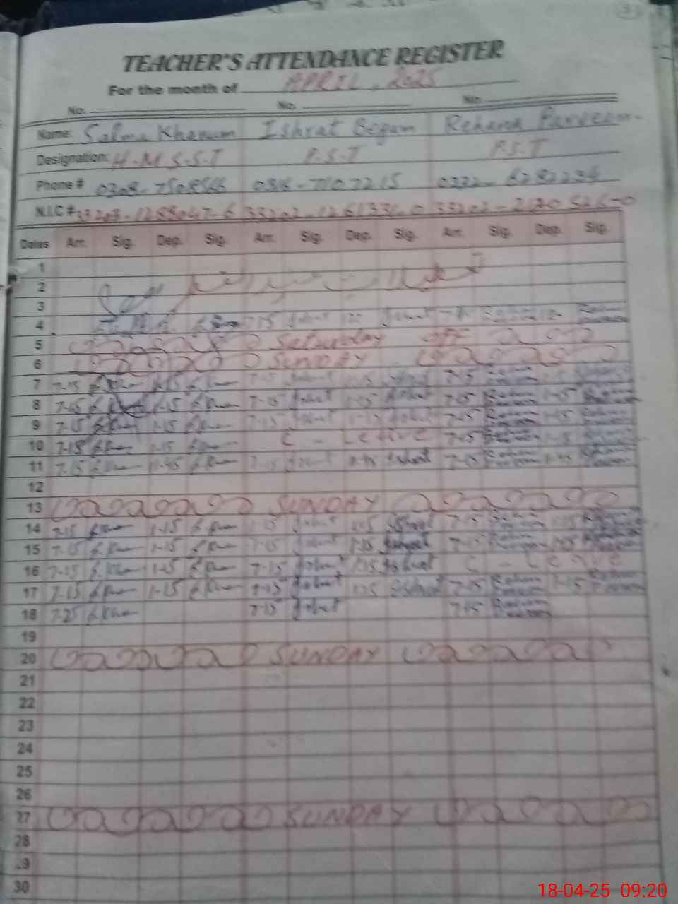 | CNIC | Full Name | Designation | R/C | Absence During Last Calender Month |