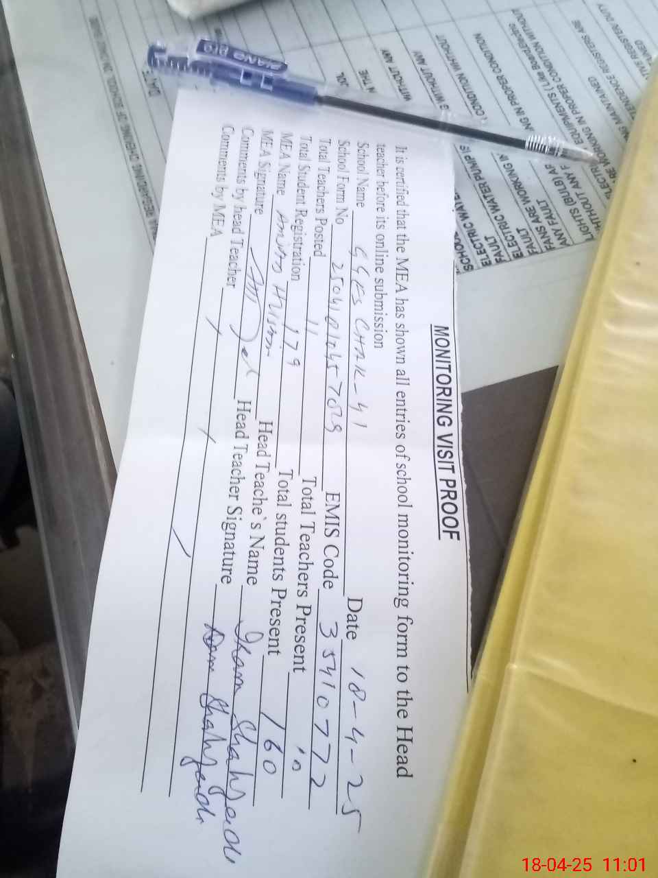 | Attendance Register | Head Teacher | MEA with School | Visit Proof |