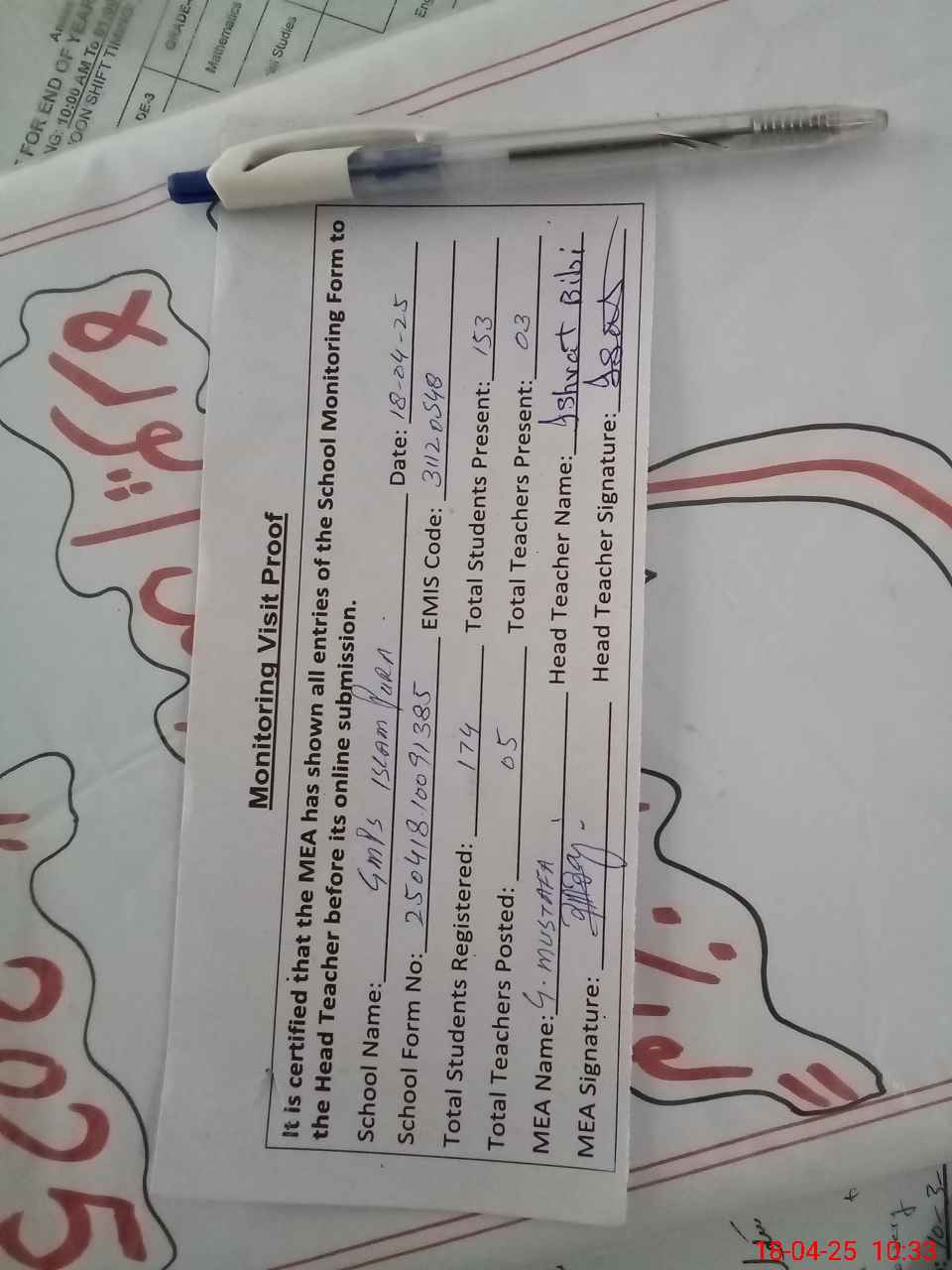 | Attendance Register | Head Teacher | MEA with School | Visit Proof |