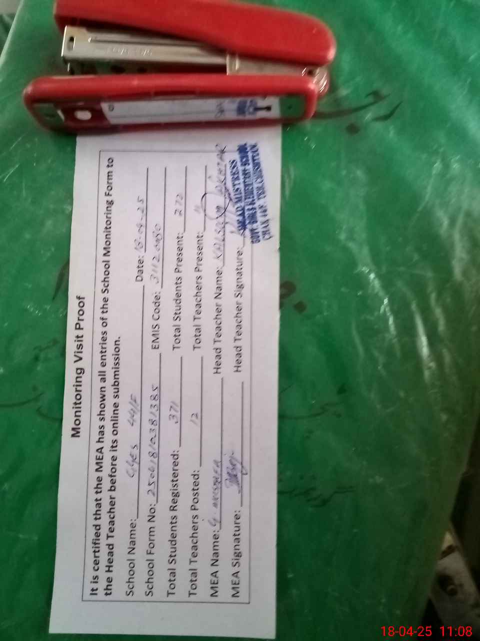 | Attendance Register | Head Teacher | MEA with School | Visit Proof |