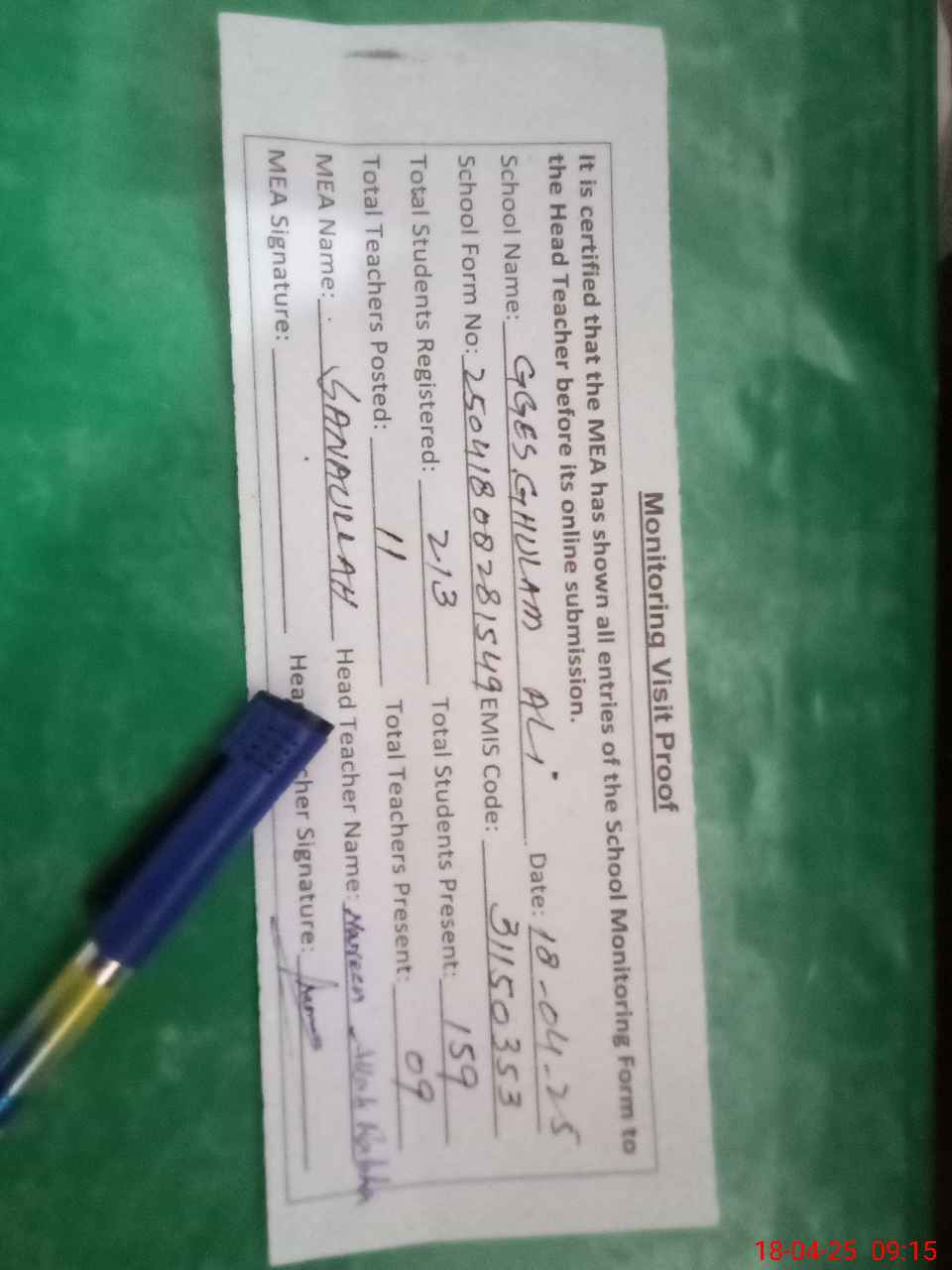 | Attendance Register | Head Teacher | MEA with School | Visit Proof |
