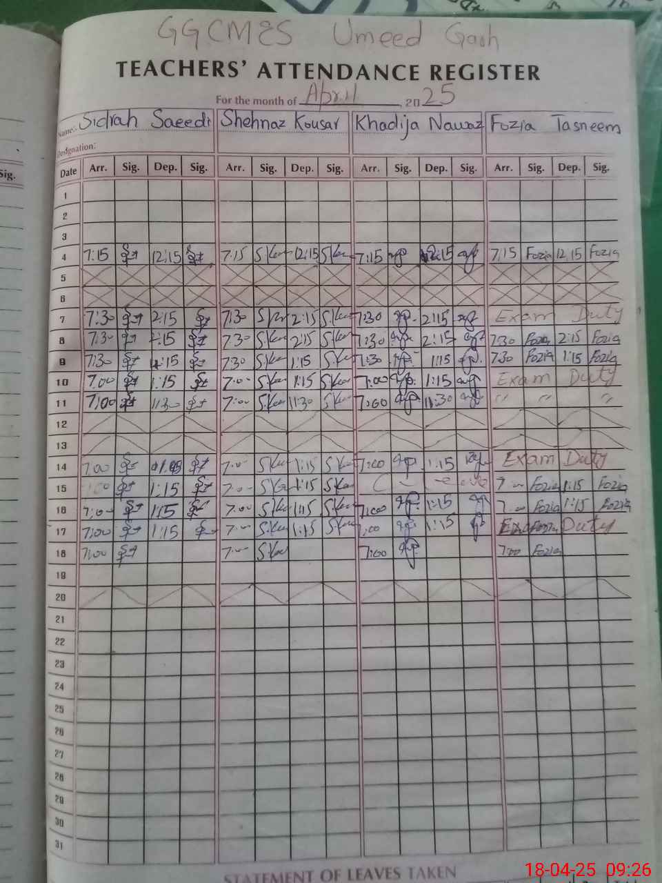 | Leave | Duty | Absent | Maternity | Medical | Ex- Pak |