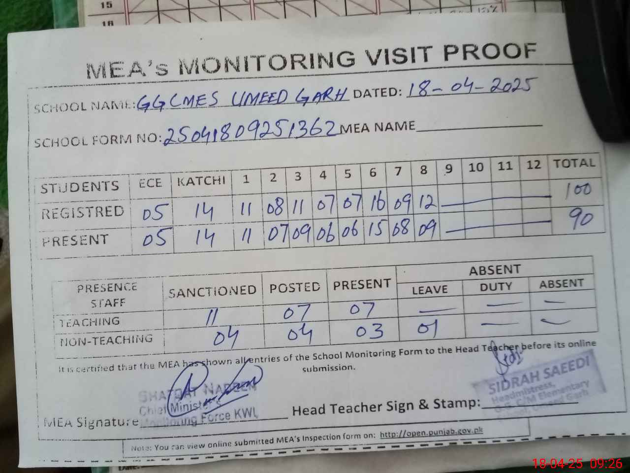 | Attendance Register | Head Teacher | MEA with School | Visit Proof |