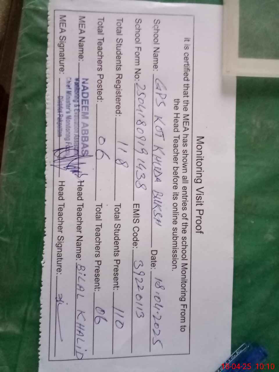 | EMIS Code: 39220113 | Name of School: GPS KOT KHUDA BUKHSH | |||