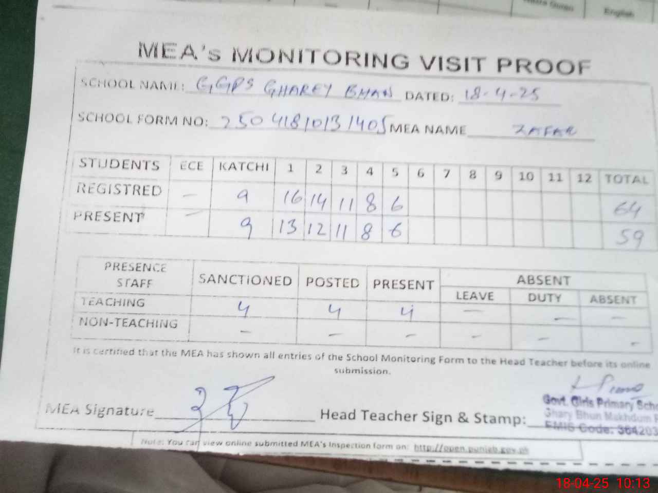 | Attendance Register | Head Teacher | MEA with School | Visit Proof |