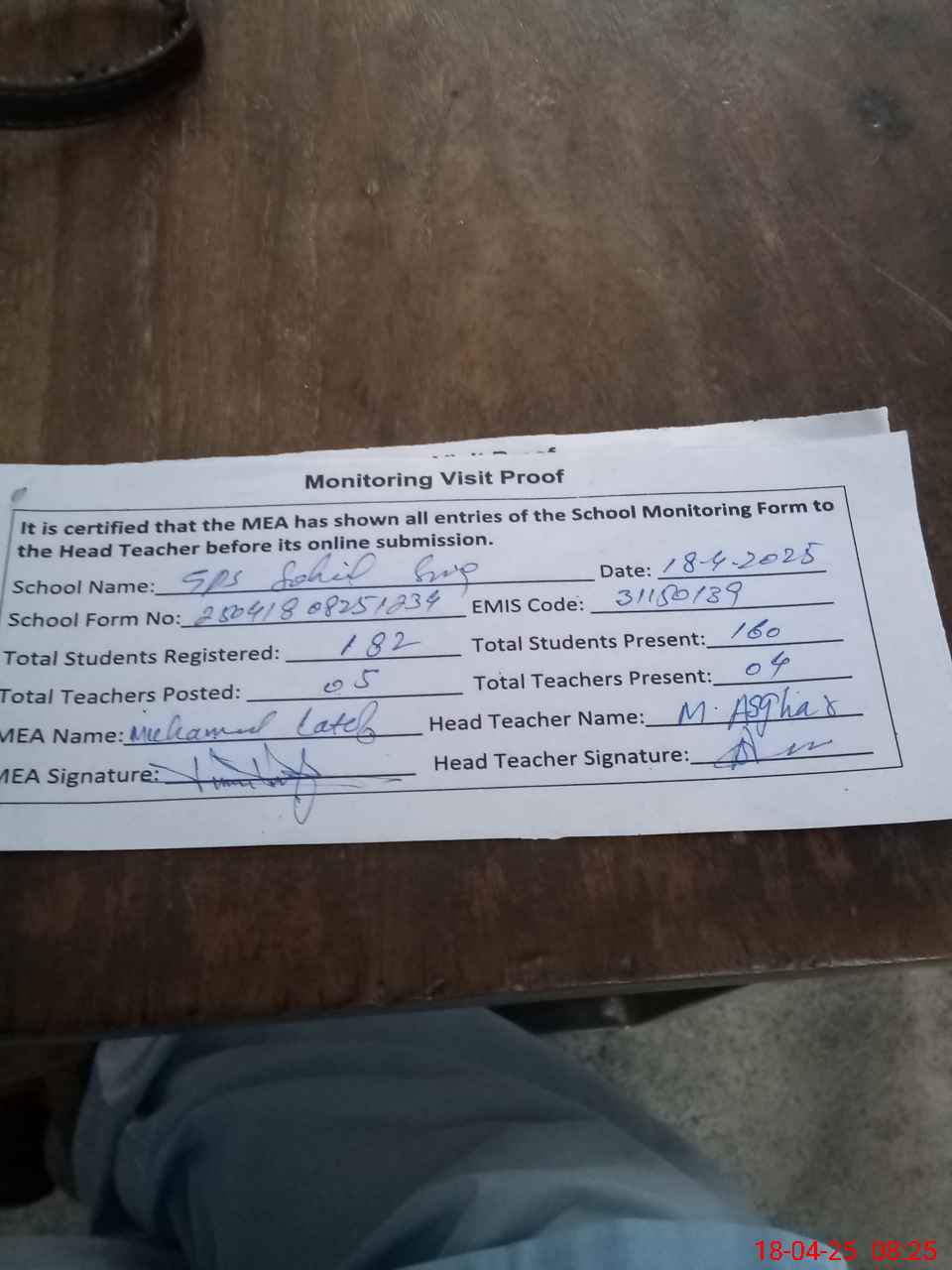 | Attendance Register | Head Teacher | MEA with School | Visit Proof |
