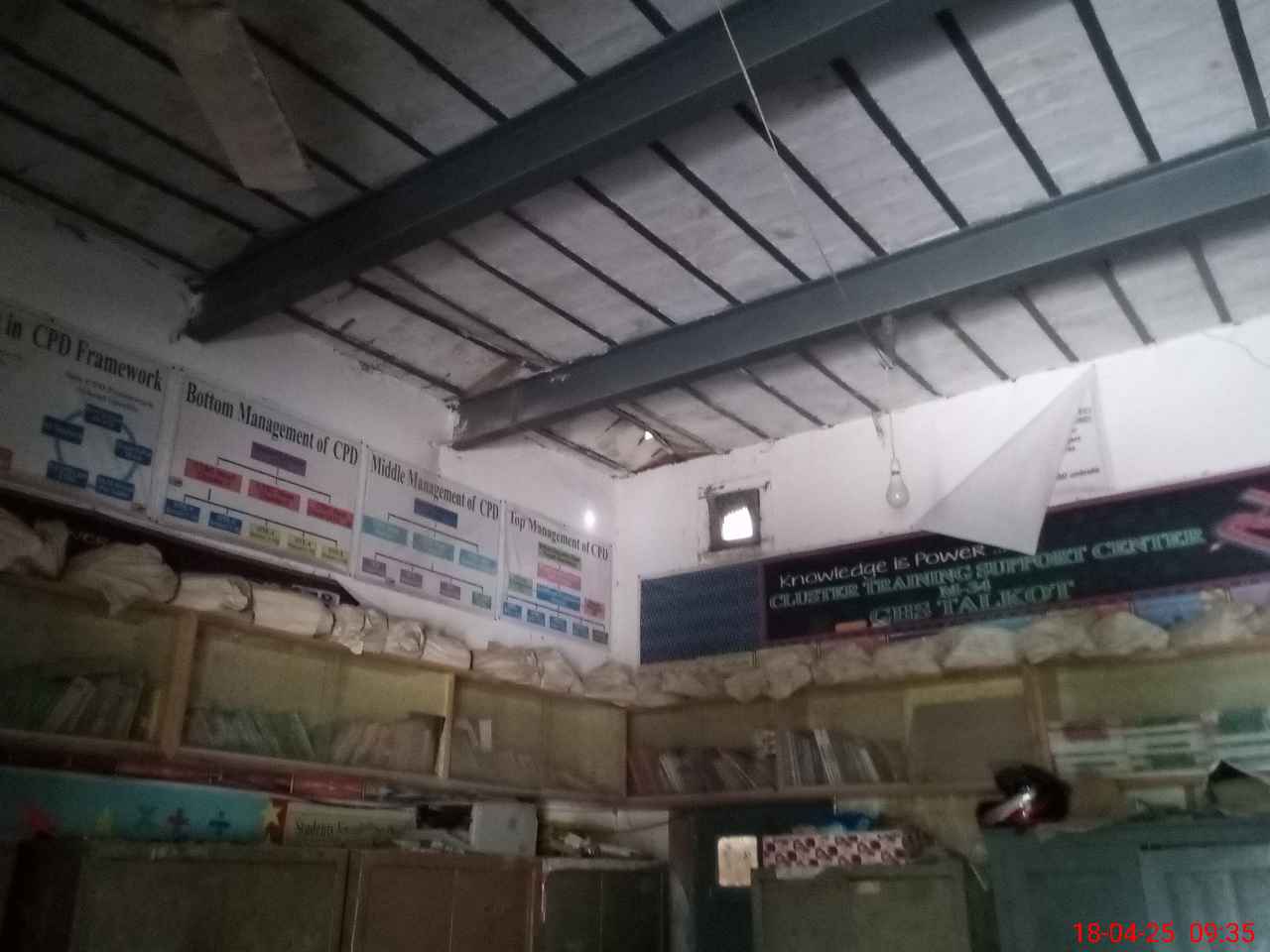 | Total no. of Classrooms: 17 No. of Classrooms Used for Teaching: 13 No. of Classrooms Storing Old Furniture, FTBs, etc: 0Comments if Any: Clerk office library and store are situated in dangerous building Only 03 PC in working condition whereas approx 35 students of 9th and 30 students of pre 9th adopted IT as subject |