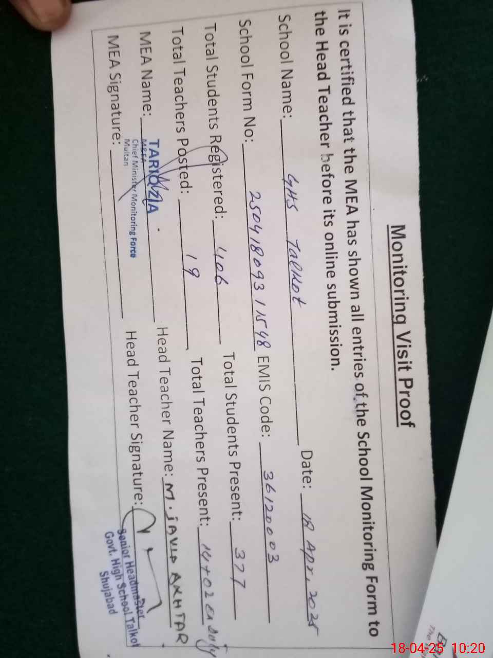 | Attendance Register | Head Teacher | MEA with School | Visit Proof |