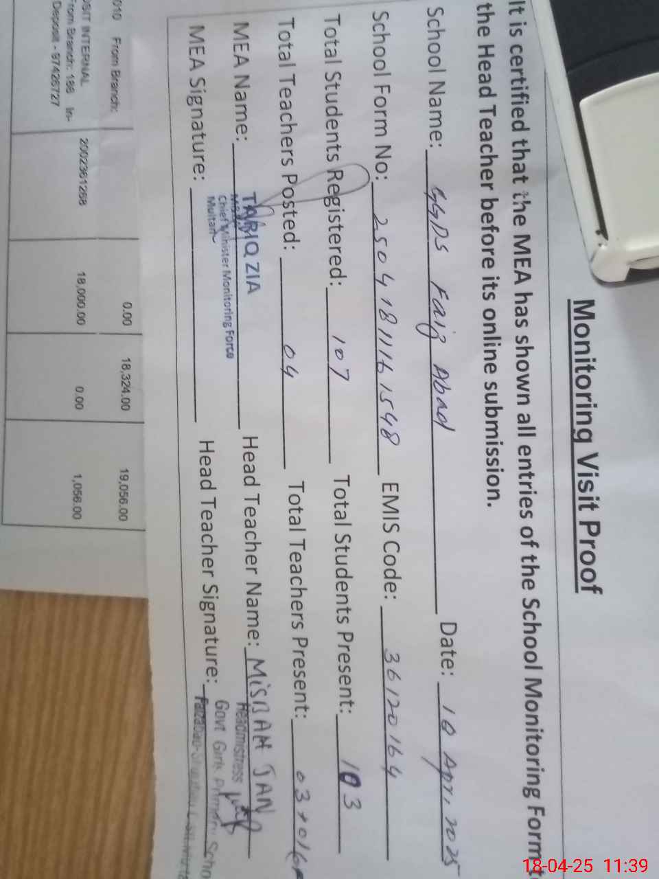 | EMIS Code: 36120164 | Name of School: GGPS FAIZ ABAD SHUJABAD | |||