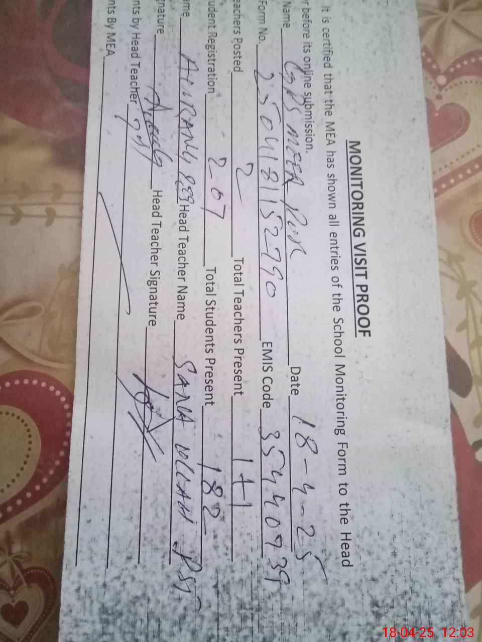 | Attendance Register | Head Teacher | MEA with School | Visit Proof |
